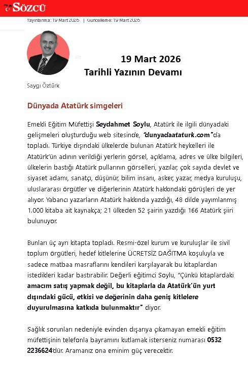 1- SÖZCÜ GAZETESİ, Köşe yazarı ve Ankara Temsilcisi Sayın SAYGI ÖZTÜRK: 22 Ocak 2021 tarihli Sözcü Haftasonu’nda. “100. YILIMIZDA 100 ÜLKEDE ATATÜRK” konulu bir kampanya başlatma önerimize katkı veren ‘100. yılda, 100 ülkede Atatürk’ başlıklı yazıyı yazmıştır. YAZI…