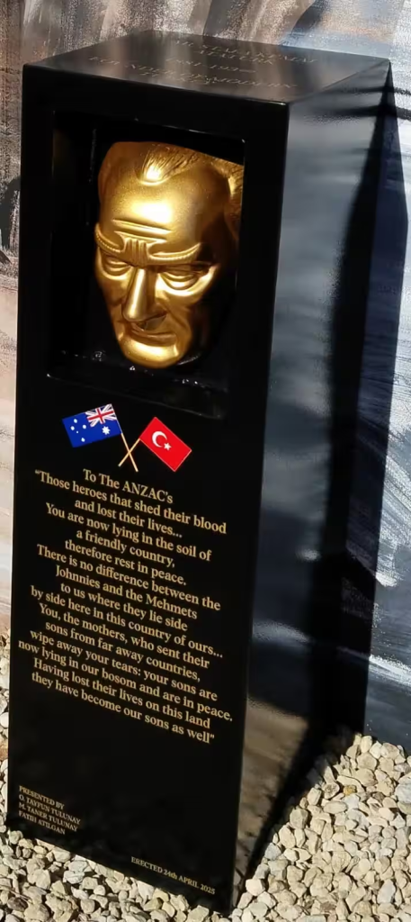 AVUSTRALYA – Ungarie: Atatürk Maskı AVUSTRALYA – Ungarie: Atatürk Maskı Ungarie, Avustralya’nın Yeni Güney Galler Eyaleti’nde bulunan, yaklaşık 400 kişinin yaşadığı, tarım ve madencilik kasabadır. Atatürk bu maskı Ungarie’de bulunuyor. Avustralya’da yaşayan Tayfun Tulunay’ın Gaziler Derneği RSL’yi ikna etmesiyle gerçekleşmiştir. Atatürk maskının bulunduğu kaidede, Atatürk’ün Annelerine Seslenişindeki sözleri (Ek-1) de İngilizce yazılıdır. Atatürk maskının da bulunduğu bu düzenlemenin açılışı 25 Nisan 2025 tarihli Anzak Günü’nde gerçekleştirilmiştir. Türk bayrağı ile Avustralya bayrağının da resmedildiği kaidenin en altında ise söz konusu mask ve düzenlemesinin Tayfun Tulunay, M. Taner Tulunay ve Fatih Atılgan’ın sunumu olduğu anlatımı yer alıyor.[1],[2] [1] sbs.com.au, “Avustralya kırsalında bir Atatürk büstü”, erişim: 10.01.2026 [2] Media Turkish Australia (.facebook.com/), “Avustralya kırsalında bir Atatürk büstü”, erişim: 10.01.2026